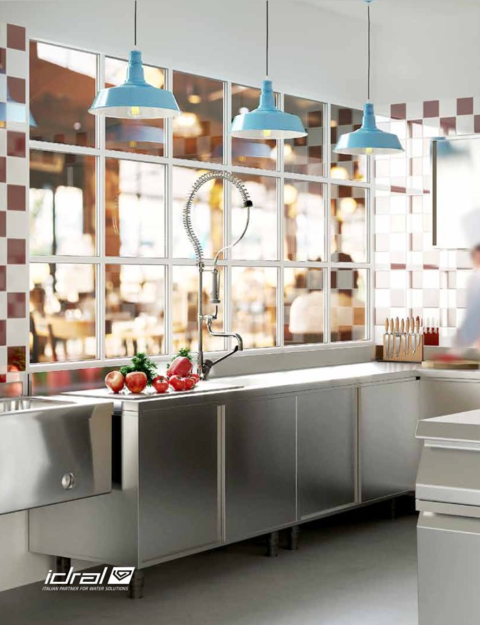 Dato lo sforzo richiesto e soprattutto i rischi legati alla mancanza di igiene, la cucina industriale deve poter contare su rubinetti e bocche di erogazione facili da usare e anche da pulire. Proprio per questo motivo, il design dei rubinetti Idral per cucine professionali è semplice ed ergonomico, con poche giunture e interstizi, in modo da ridurre la possibilità che si accumuli sporcizia: in pratica, parliamo di prodotti che si possono mantenere puliti con poco sforzo e in poco tempo. Offriamo inoltre molti tipi di rubinetti con doccetta che permettono di ottenere risultati eccellenti durante il prelavaggio dei piatti o la pulizia manuale in quanto ergonomici e con una o più bocche. Il gruppo doccia di prelavaggio, infatti, consente di direzionare l'acqua direttamente sui cibi o sui piatti da lavare, garantendo un'igiene profonda e una pulizia molto accurata nella cucina professionale.